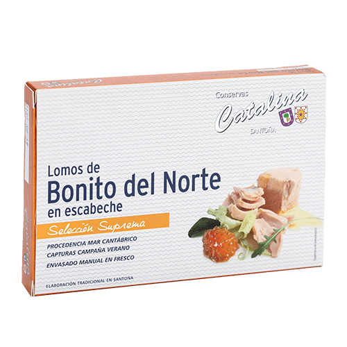 El Bonito del Norte de Conservas Catalina es todo un placer para los sentidos que puede utilizar en múltiples platos. Un manjar para disfutar en cualquier ocasión. Pescado con caña, de uno en uno, con el método de cacea, durante la costera de verano. Esta técnica ancestral de pesca selectiva es respetuosa con el medio ambiente y los fondos marinos.